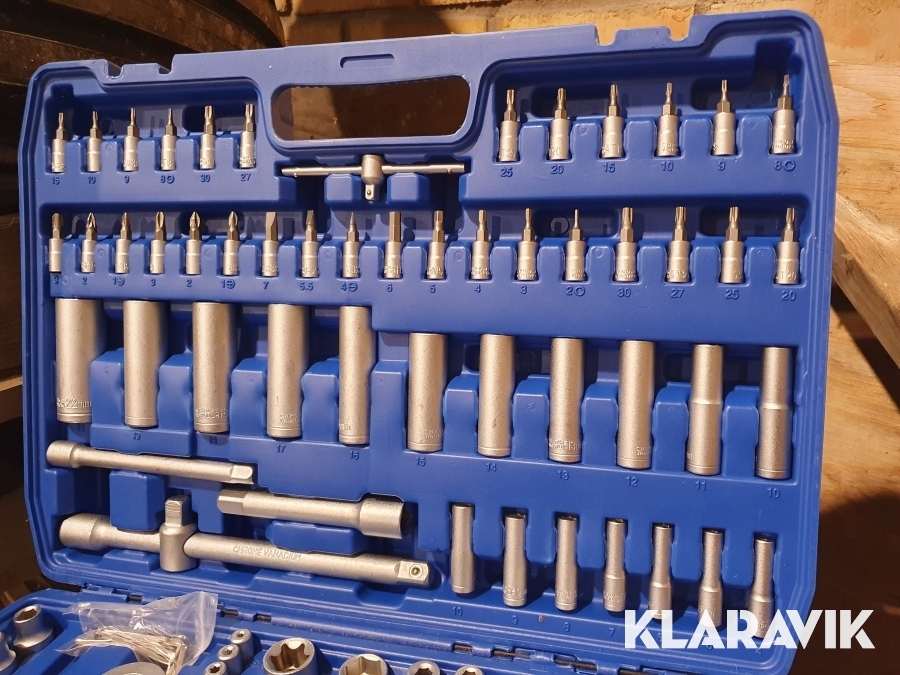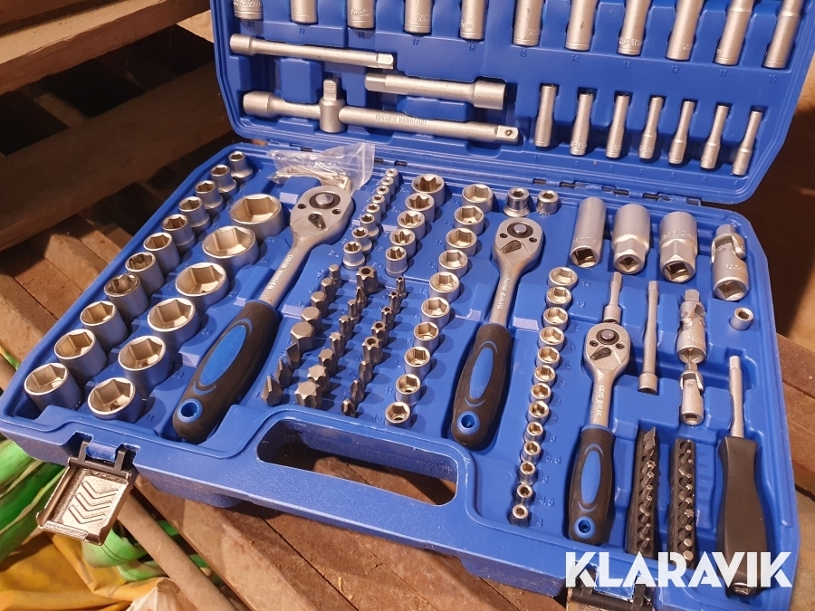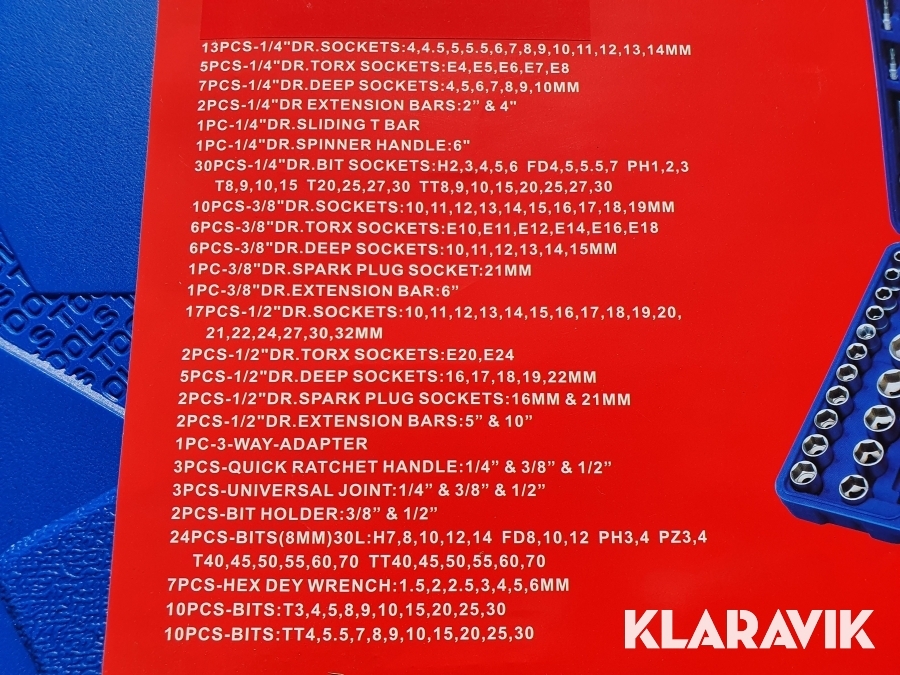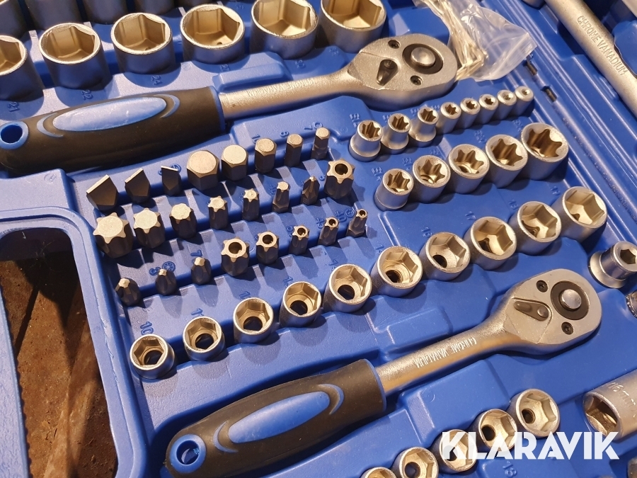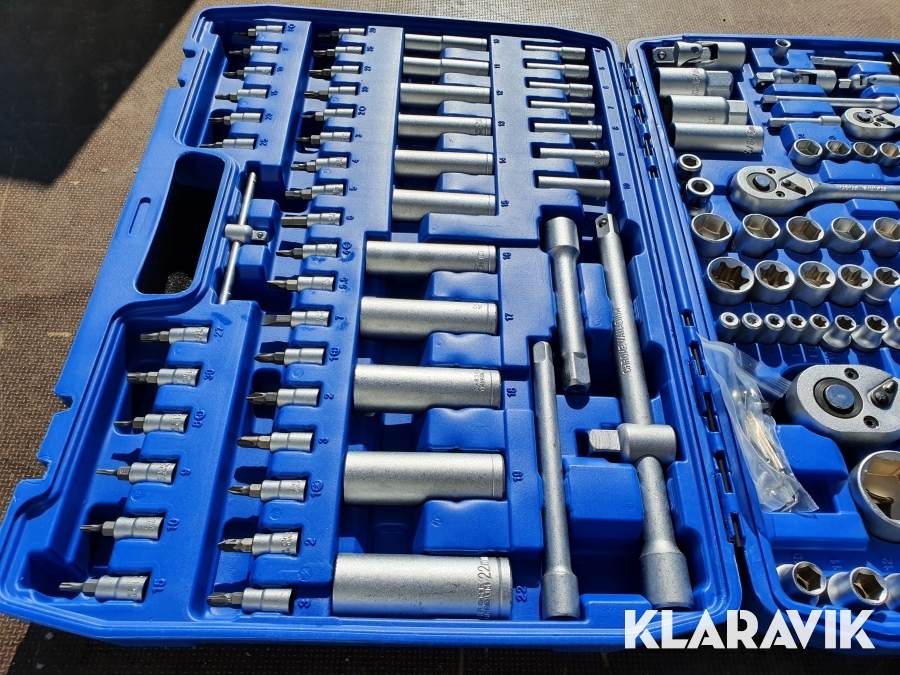 Väskan innehåller en mängd olika hylsor, spärrskaft, spärrhandtag, T-stångshandtag, vridhandtag, förlängare, bits, universalknutar, torxnyckel, insexnycklar mm.